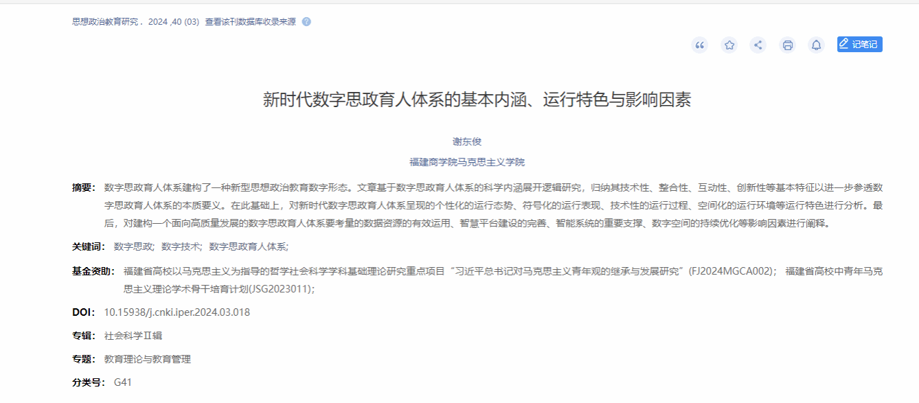 近日,米兰官网谢东俊副院长在北大核心期刊《思想政治教育研究》发表文章《新时代数字思政育人体系的基本内涵、运行特色与影响因素》
