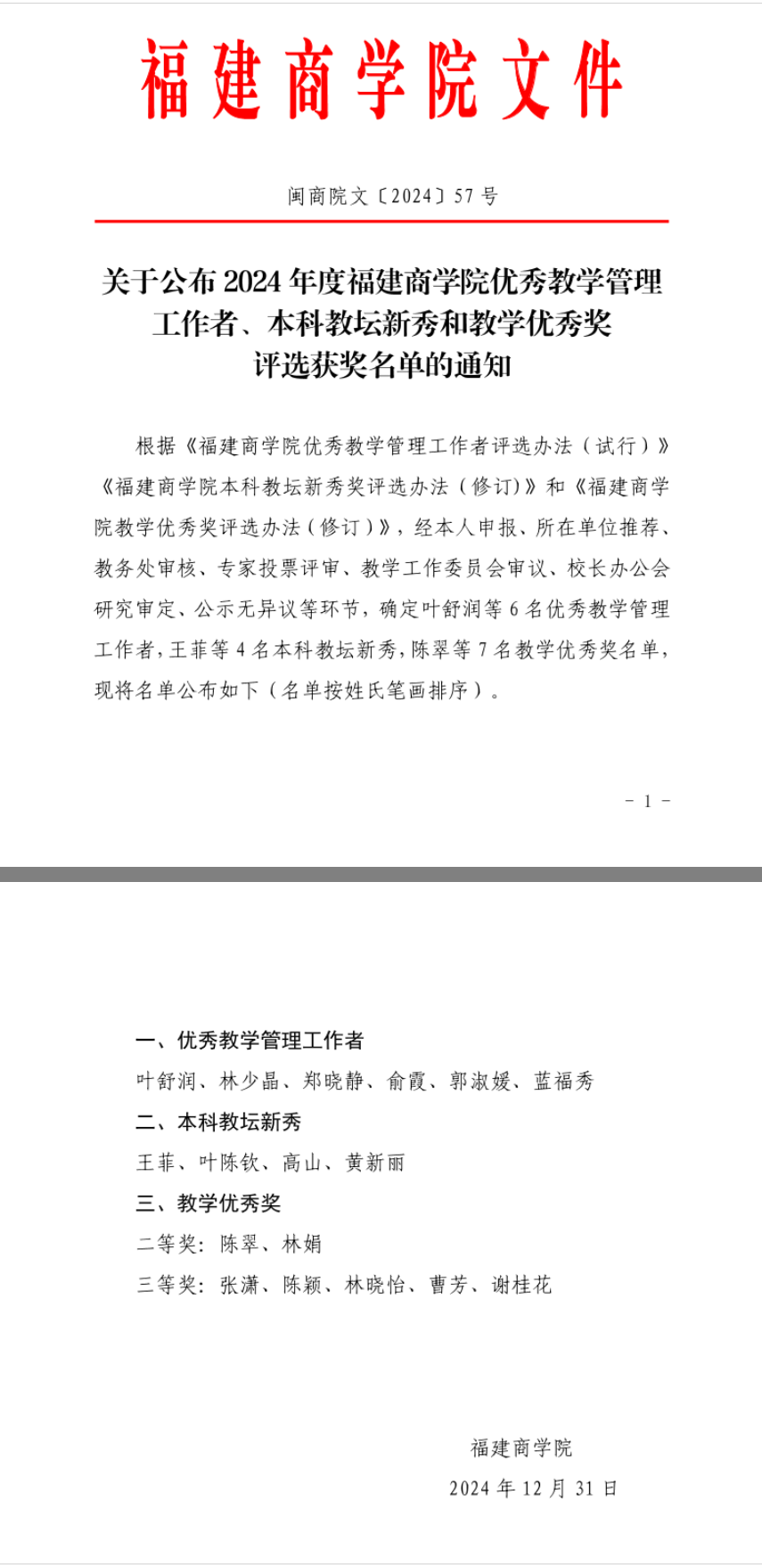 喜讯:经过评审,米兰官网蓝福秀老师获得2024年度福建商学院优秀教学管理工作者荣誉称号,叶陈钦老师获得本科教坛新秀荣誉称号,陈翠老师获得教学优秀奖荣誉称号。