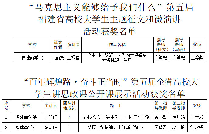 近日,《中共福建省委教育工委关于公布习近平新时代中国特色社会主义思想大学习领航计划系列主题活动获奖名单的通知》(闽委教思〔2022〕3号),米兰官网选送优秀作品参评省级公开课、微电影展示以及主题征文和微演讲活动,荣获二等奖1项,三等奖1项,优秀奖1项。