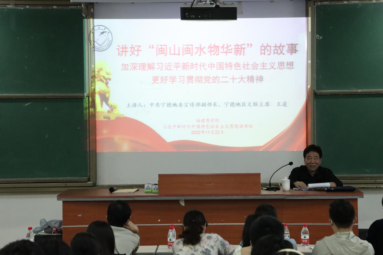 闽山闽水物华新,“习言习语”催人进。11月22日晚,中共宁德地委宣传部原副部长、原宁德地区文联主席王凌研究员受邀莅临米兰官网,为米兰官网师生作了题为《讲好“闽山闽水物华新”的故事,加深理解习近平新时代中国特色社会主义思想,更好学习贯彻党的二十大精神》的专题讲座。校党委副书记吴访益,米兰milan官方网站、机关党委负责同志,学校习近平新时代中国特色社会主义思想学生读书社、教职工读书社社员代表参加。