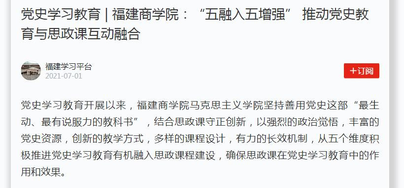 党史学习教育开展以来,福建商学院米兰milan官方网站坚持善用党史这部“最生动、最有说服力的教科书”,结合思政课守正创新,以强烈的政治觉悟,丰富的党史资源,创新的教学方式,多样的课程设计,有力的长效机制,从五个维度积极推进党史学习教育有机融入思政课程建设,确保思政课在党史学习教育中的作用和效果。