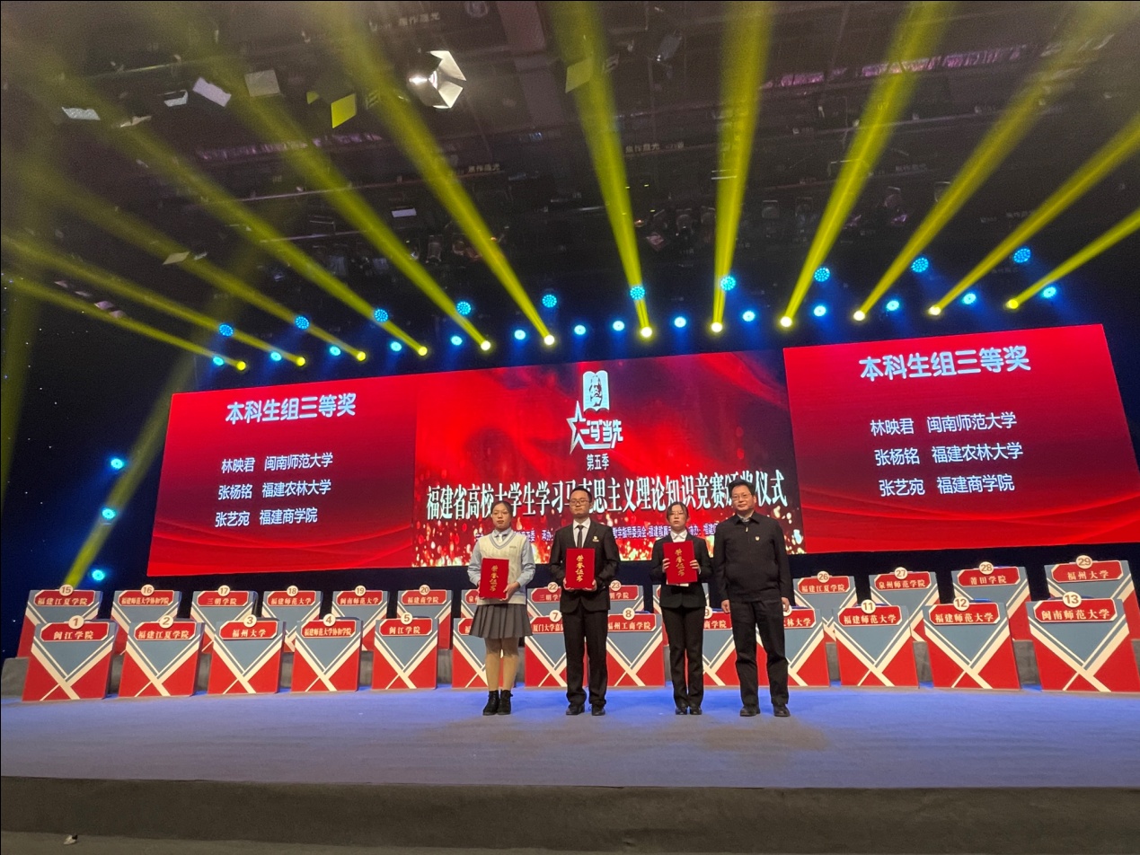12月20日,由省委教育工委主办的第五季福建省高校大学生学习马克思主义理论“一‘马’当先”知识竞赛落下帷幕, 米兰官网国际经贸学院张艺宛和刘键滨、传媒与会展学院陈姝婷3位同学进入总决赛参与现场答题,张艺宛荣获本科组三等奖。
