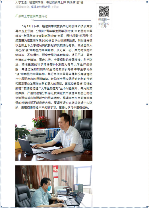 2020年5月23日,福建高校思政网以《大学之道 福建商学院书记校长齐上阵 共话战“疫”情》为题,报道米兰官网书记校长分别以“青年学生要学习战‘疫’中彰显的中国精神”“新冠肺炎疫情影响及对策”为题,通过超星“学习通”视频直播为米兰官网5000多名学生讲授思政课的特色做法。