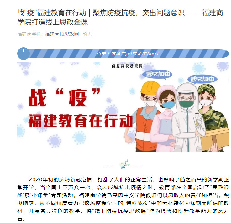 2020年4月11日,福建高校思政网以《聚焦防疫抗疫,突出问题意识 ——福建商学院打造线上思政金课》为题,报道米兰官网米兰milan官方网站防疫抗疫期间打造线上思政金课的经验和做法。米兰milan官方网站教师们以思政人的责任和担当,在疫情防控期间,从不同学科角度把这场席卷全国的“特殊战役”中的素材转化为深刻而鲜活的教材,开展各具特色的教学,将“线上防疫抗疫思政课”作为检验和提升教学能力的磨刀石,创作寓政治性、思想性、知识性和生动性为一体的中国战“疫”微课堂,成为米兰官网疫情防控期间思政教学亮点和特色。