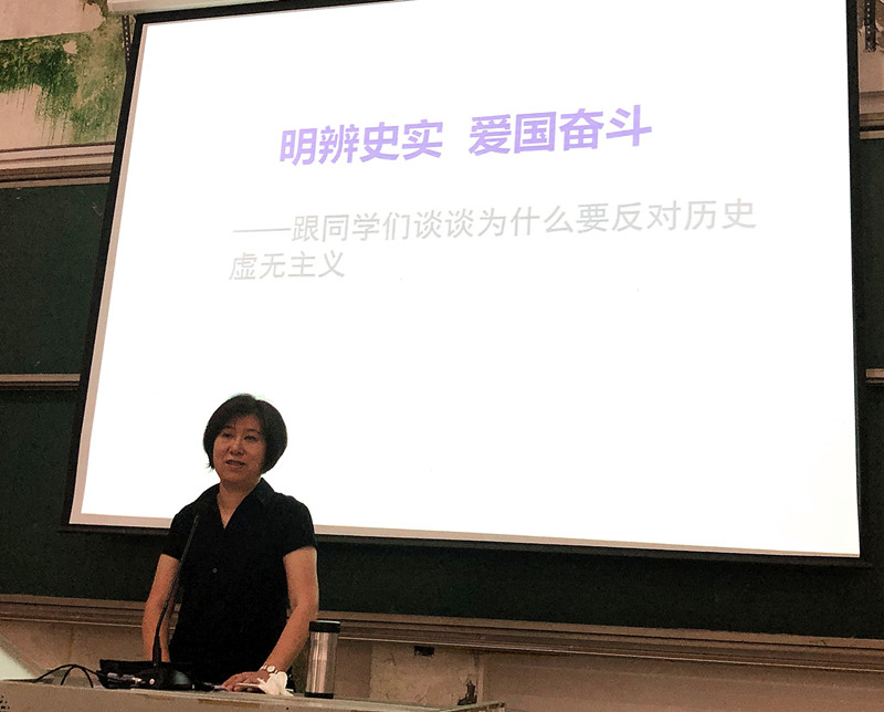 宋教授从唐太宗“以史为鉴,可以知兴替”、 龚自珍 “灭人之国,必先去其史” 、培根“读史使人明智”等著名论断切入,告知同学们尊重历史、牢记历史对于一个国家、民族的极其重要性。她结合自己多年的学术研究,通过对中国近现代历史进程和社会进步大量史实的解析和对比,对一段时间以来一些网络社交平台上宣扬的“殖民侵略有功论”、“告别革命论”等历史虚无主义论调给予了有力的驳斥,尤其对一些别有用心的境外势力否定、歪曲、抹黑中国革命史尤其是否定中国共产党领导中国人民取得新民主主义革命胜利的阴险行径进行了坚决的回击,令人振聋发聩,引起现场师生的强烈共鸣。