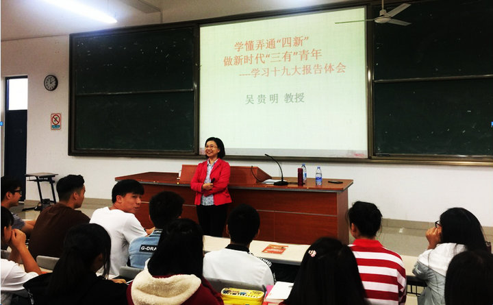 11月10日下午,福建省委党校吴贵明教授应邀为米兰官网2017级工管系学生上了题为《学懂弄通“四新” 做新时代“三有”青年》的形势与政策课。