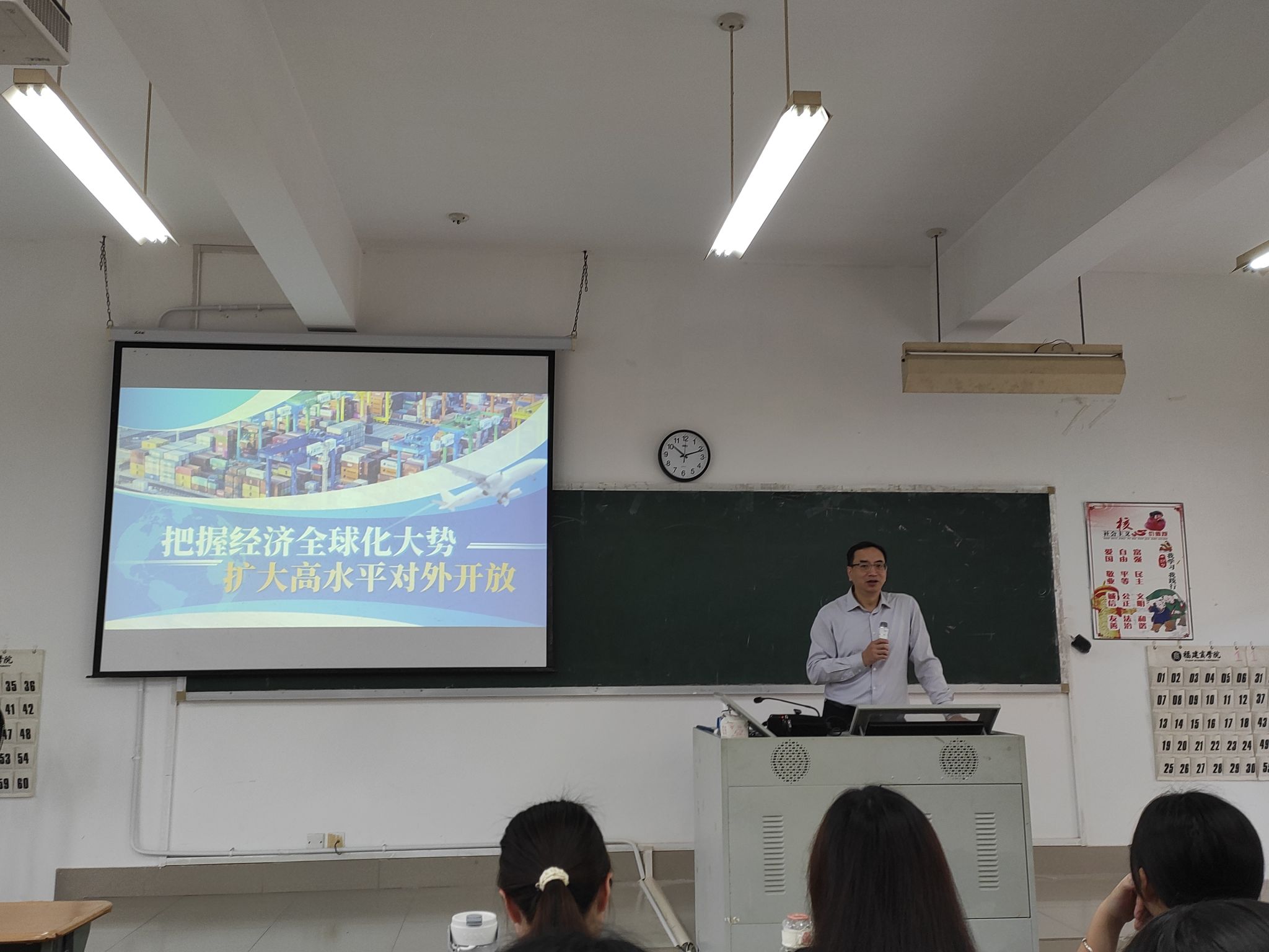 6月6日上午,学校党委副书记蒲文庆于马尾校区远志楼T2室,为2023级供应链管理1、2班学生讲授题为《把握经济全球化大势 扩大高水平对外开放》的思政课。