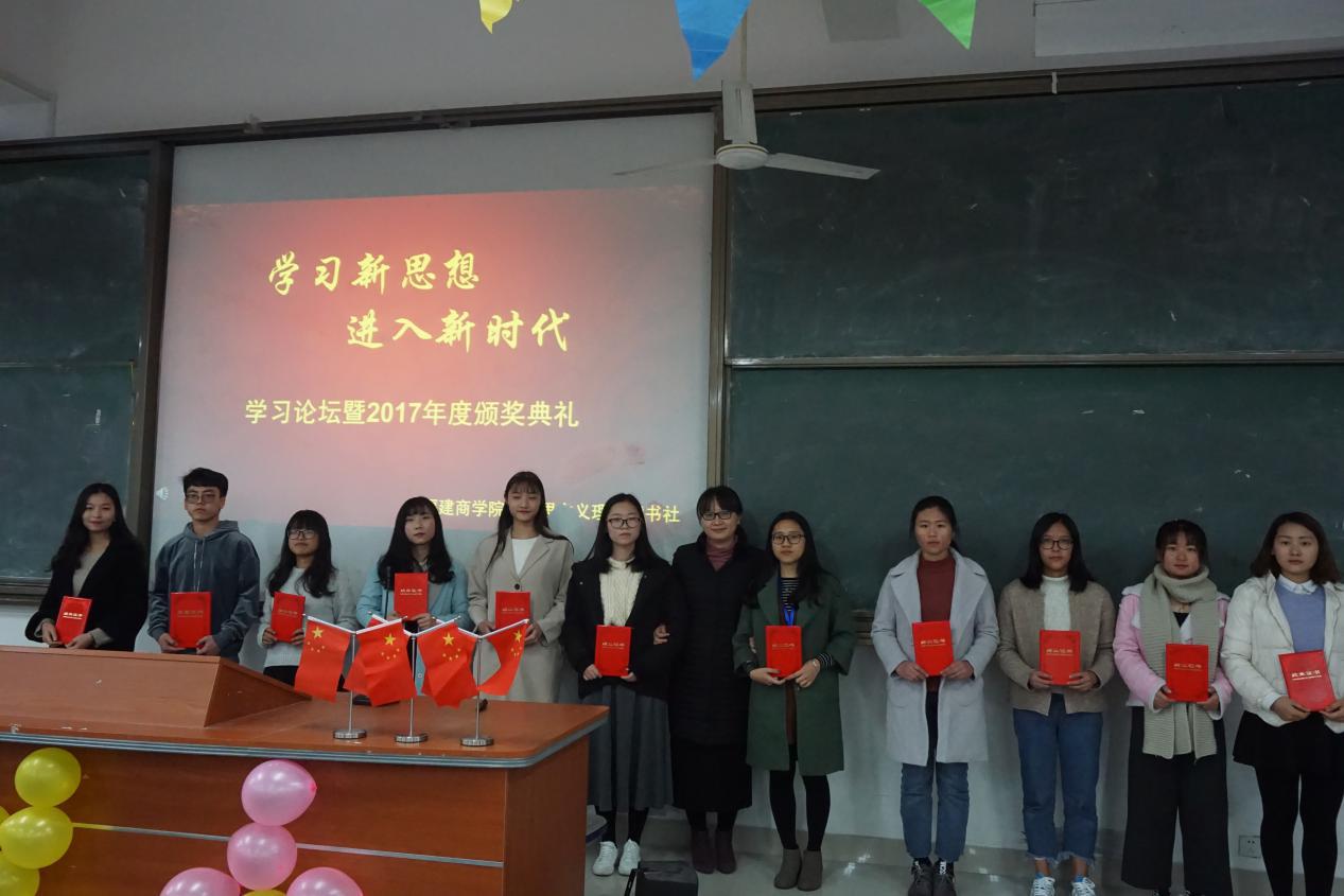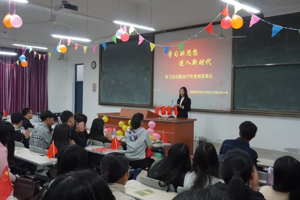 风正扬帆当有为,敢于担当筑辉煌。12月12日,在全省高校兴起学习宣传党的十九大精神热潮之际,米兰官网马克思主义理论读书社在连江校区诚信楼大阶二举办了“学习新思想,进入新时代”学习论坛暨2017年度颁奖典礼。本次大会邀请了米兰官网米兰milan官方网站教师代表、读书社二班三班共200余名学生,共同学习领会习近平新时代中国特色社会主义思想,共同研讨交流党的十九大精神与青年之间的关系。