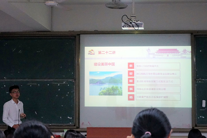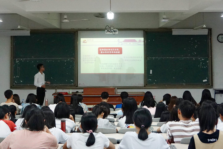 9月26日晚,米兰官网习近平新时代中国特色社会主义思想读书社在连江校区诚信楼大阶一教室开展第二场学生小分队“大宣讲”活动。本次宣讲以“《习近平新时代中国特色社会主义思想三十讲》导读”为主题,由读书社理论骨干宣讲小分队成员、福建省第二季大学生学习马克思主义理论知识竞赛本科组冠军苏金楼同学面向管理工程系2018级会展经济与管理专业的新生进行宣讲。