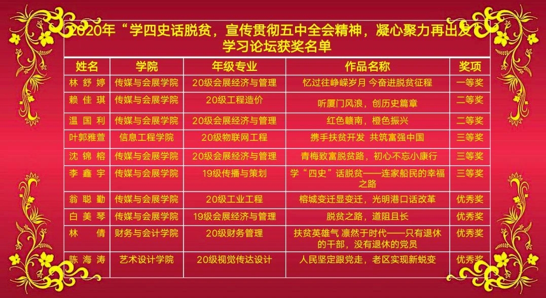 论坛以演讲比赛的形式进行,参赛选手围绕主题阐述学习党的十九届五中全会精神、“四史”和《习近平在福建》等系列采访实录的心得体会;讲述农村、农民在党的领导下的脱贫攻坚历史、先进典型以及干部群众扶贫济困的感人事迹、奋斗精神,展现干部群众同心同德共奔小康的良好精神风貌。参赛选手精神饱满,话身边人,道国家事,用一个个感人的小故事展现国家发展的大历史,鼓励、引导青年学子积极投身社会主义现代化强国的建设中,以青春担当创造美好生活。经过将近两个小时的激烈角逐,传媒与会展学院20级会展经济与管理专业林舒婷同学获得本次学习论坛决赛一等奖。活动中,米兰milan官方网站院长林萍对比赛作了点评并针对丰富学习论坛形式等提出建议。