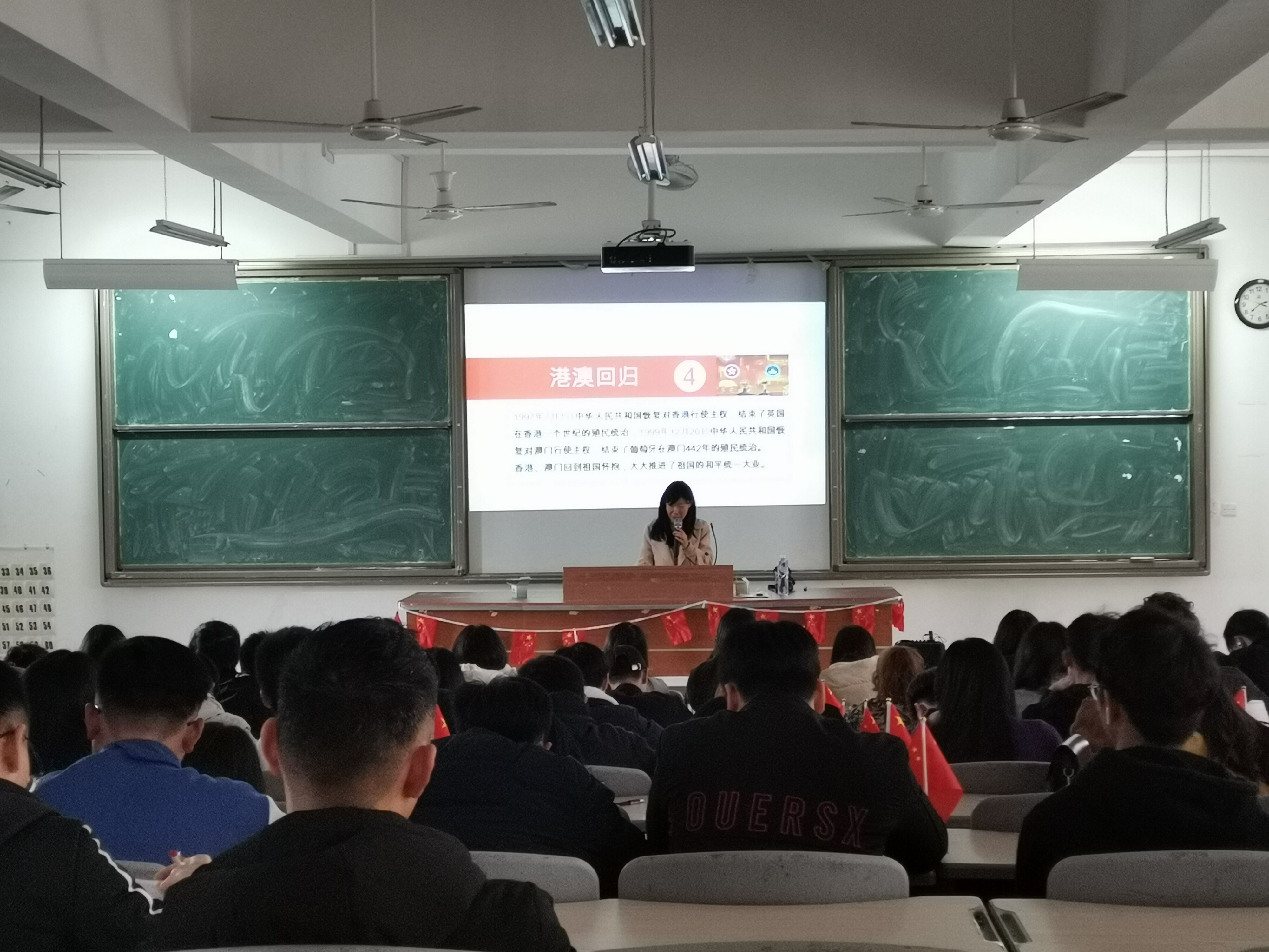 李莹副教授围绕新中国成立以来的发展历程,梳理了70年来国家发展取得的包括“两弹一星”、“载人航天”、“港澳回归”等十大成就;详细介绍了“中国桥”、“中国路”、“中国车”、“中国港”、“中国网”等五大圆梦工程;从衣、食、住、行四个方面阐述了中国普通百姓的生活巨变;李老师从“坚持中国共产党的坚强领导”等方面总结了新中国70年的发展成就给予我们的历史启示,并从“不忘初心、牢记使命”等方面解读了新时代青年应如何助力祖国发展。