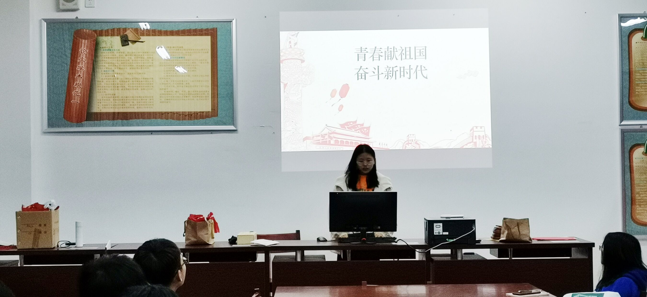 2019年12月19日晚,校习近平新时代中国特色社会主义思想读书社在自强楼活动室开展以“青春献祖国 奋斗新时代”为主题的宣讲活动,这次活动由读书社段慧玉、徐桢两位同学进行宣讲,读书社部分成员参加此次学习。