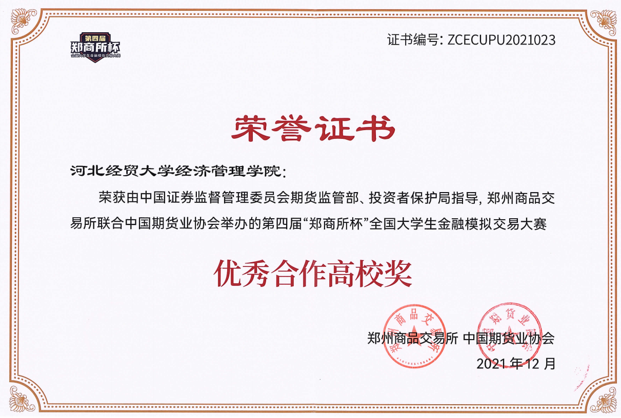 近日,第四届“郑商所杯”全国大学生金融模拟交易大赛落下帷幕并揭晓获奖情况。开云官网首次参加此项竞赛,实现了期货期权领域专业竞赛的历史性突破,在参赛师生的共同努力下,同浙江大学、南开大学等全国77所高校一同荣获优秀合作高校奖。