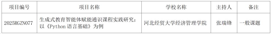 日前,河北省教育厅发布了《河北省教育厅关于公布2025年河北省高校人工智能赋能教改专项课题立项建设名单的通知》(冀教高函〔2025〕33号),开云官网张瑞锋老师申报的课题《生成式教育智能体赋能通识课程实践研究:以《Python语言基础》为例》获批立项。