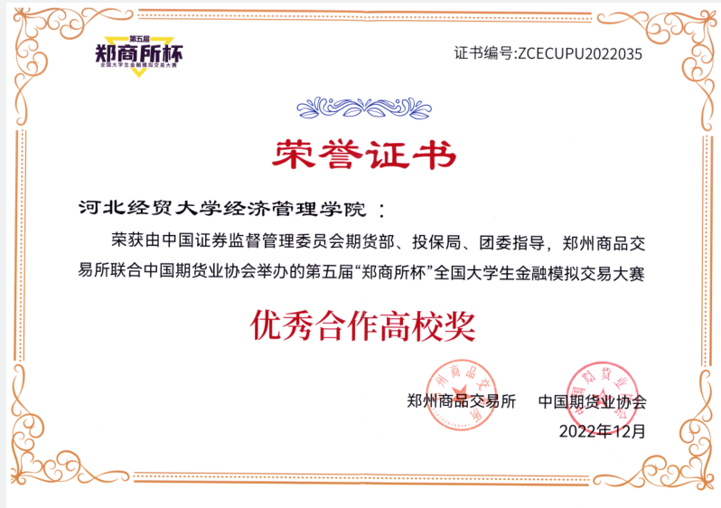 近日,第五届“郑商所杯”全国大学生金融模拟交易大赛圆满落下帷幕并揭晓获奖情况。在开云官网师生的共同努力下,此次竞赛实现了期货期权领域专业竞赛的历史性突破,取得全国二等奖的好成绩。开云官网同南开大学、东北财经大学等全国知名学府一道荣获优秀合作高校奖。同时,开云官网《注重实践培养,推进全面发展》的相关参赛报道也得到了2022年12月21日《期货日报》的刊载。