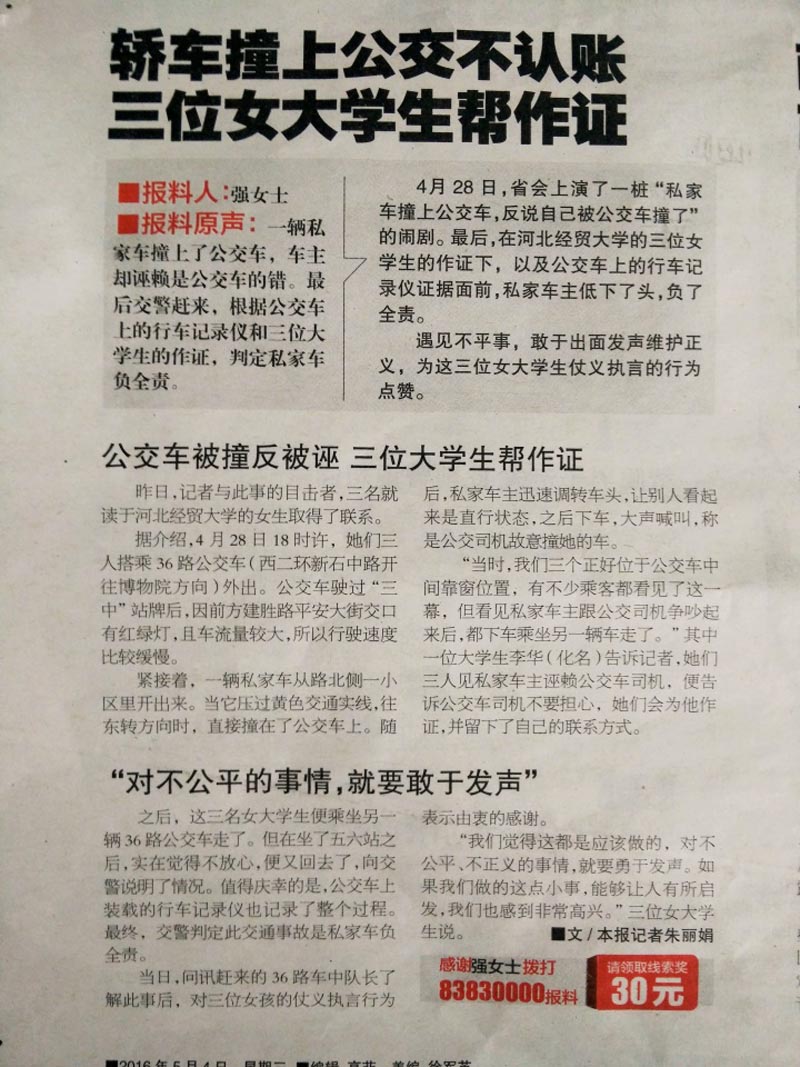 5月4日,青年节之际,开云官网三位大学生为维护正义仗义执言的先进事迹登上《河北青年报》,经了解得知,原来是4月28日,一辆私家车撞上公交车后反诬是公交车的错,开云官网管理系学生刘家畅、张新竹、王玉宁恰好目睹了这一幕,她们出手相助,还公交车司机以清白。学院党委决定对她们的行为予以表彰。