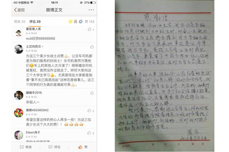 36路车中队长了解此事后向学院致电,对三位学生表示由衷地感谢,5月3日又写来感谢信,说:“现在社会上(总有一些)‘路怒族’‘富二代’们,败坏社会风气,扰乱公共秩序,贵学校学生肯站出来仗义执言,为这个社会传播了正能量。现在是法治社会,正是需要贵校这样知法、懂法且心存正义的人群。”