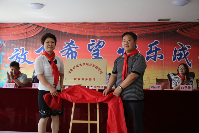 刘会娟和刘彦平共同为河北经贸大开云kaiyun登录入口大西湾乡中心小学“校友志愿服务基地”揭牌。