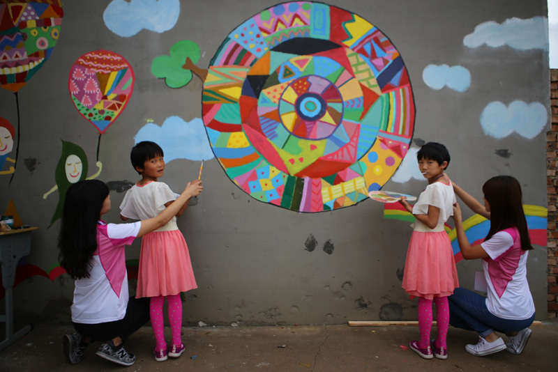 志愿者亲手为孩子们彩绘墙壁