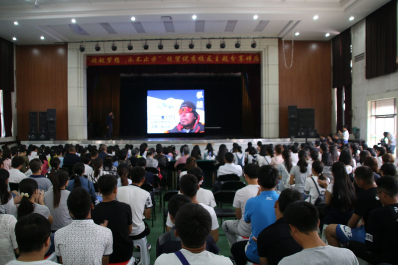 张梁通过分享自己入学时的故事,瞬间拉近了与同学们之间的距离;随后,他用幽默诙谐亲切的语言,将自己2000年至今,16年来已攀登12座8000米以上雪山、七大洲最高峰中的4座,抵达 “世界三极”(珠峰和南北极),并开始环球航海征程的传奇经历娓娓道来。他用举重若轻的语气讲述了登山探险过程中经历的种种危险,在极地探险过程中正面面对北极熊的惊险一刻;用孩童般的语调描述着登顶时喜悦和沿途的美景。作为首批完成“12+2”终极挑战的中国人,张梁用自己的经历深刻的诠释了挑战极限、勇者无疆的探险家精神,未来的他还将继续他“14+7+2”及环球航行的梦想。他告诉同学们,人生就像攀登一座山峰,不在于过程,也不在于结论,而在于精神和态度;他鼓励同学们不要畏惧困难,要勇敢的跨越自己心中的高峰。