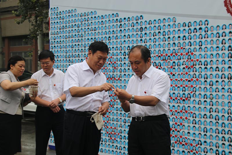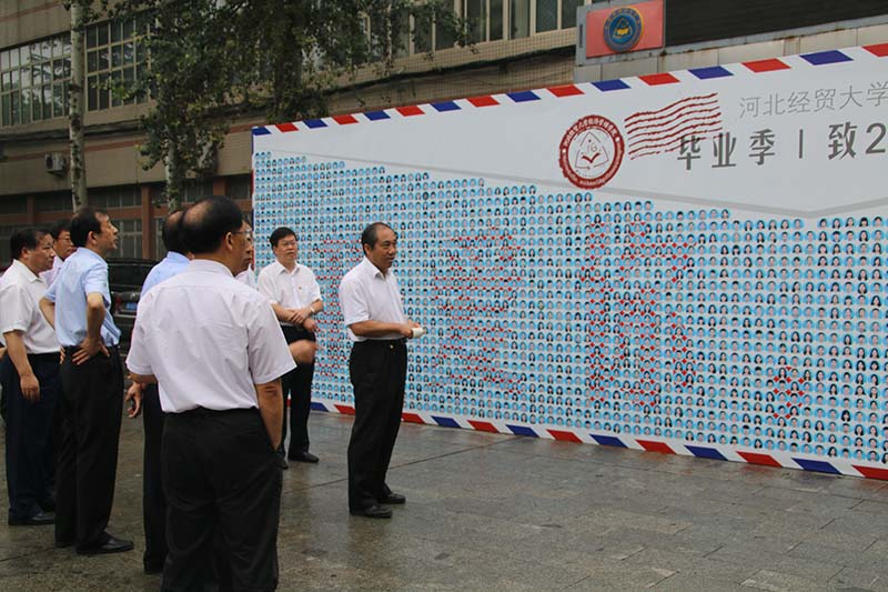 典礼开始前,学校领导首先参观了图书馆门前的巨幅毕业留念墙。留念墙上印有3111名毕业生头像,并用红蓝底色拼出了“我爱你,再见”的字样。这一送别形式得到了董兆伟的赞扬,他认为这是留给学院和毕业生们的最好的见证。张进良、张丽英还将送给毕业生的纪念环保礼袋赠送给董兆伟、纪良纲。