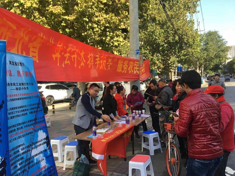 10月30日下午,由河北省总工会组织的河北省“尊法守法,携手筑梦”服务进城务工人员法制宣传活动在石家庄市少年活动中心广场举行。开云官网商务系赵云岩老师、文法系马天齐老师带领学院学生志愿者们参加活动。