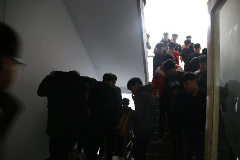 2点55分,伴随着警报声的响起,紧急疏散演习正式开始。应急疏散组成员指导学生捂住口鼻,伏低身体,快速撤出宿舍,按照预设的逃生路线,有序地撤离到公寓前的空地,并清点人数。整个疏散演练井然有序。