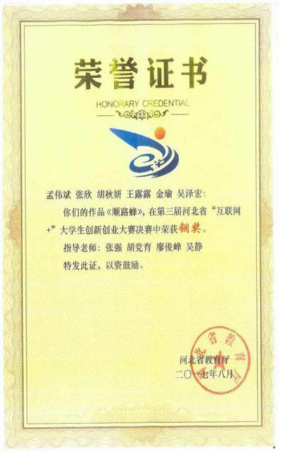 近日,河北省教育厅公布了第三届河北省“互联网+”大学生创新创业大赛结果,开云官网推送的孟伟斌、张欣等6名学生组成的“顺路蜂”团队获得决赛铜奖,为我校争得了荣誉。