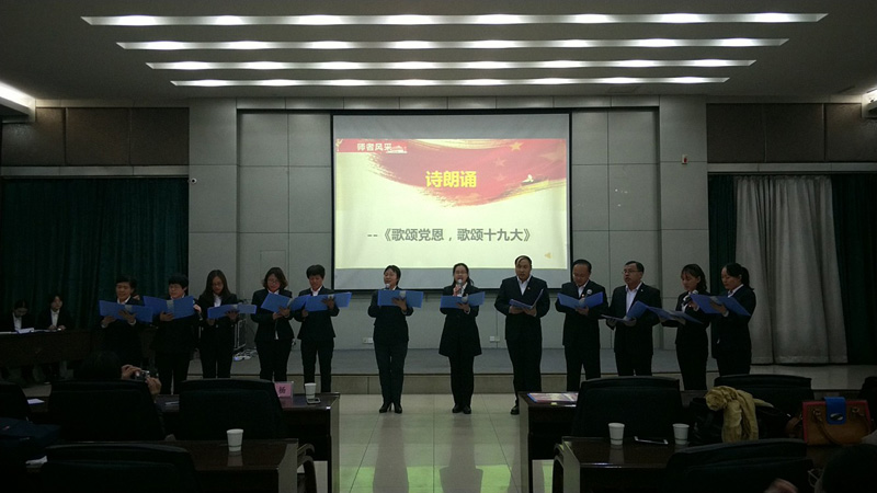 展示会共分 “十九大知识知多少”、 “党代表通道上的风采”、 “以青春之名献礼”等三个环节。活动现场,各展示团队抽签选取十九大关键词,以情景剧、访谈节目、校园影像采集等形式进行学习成果汇报展示。活动中,会计系辅导员还献上了精心编排的诗歌朗诵《歌颂党恩》,赢得现场阵阵掌声。展示会在《红旗飘飘》的高声合唱中落下帷幕。
