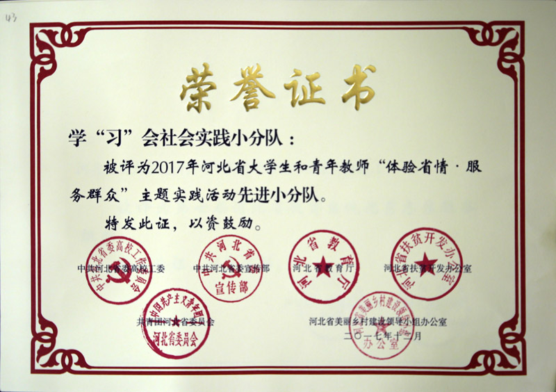 在2017年暑期大家访活动中,辅导员楚晓梅、盖云凤、刘佳、王丽君被评为河北省高校辅导员“大家访”活动先进个人。