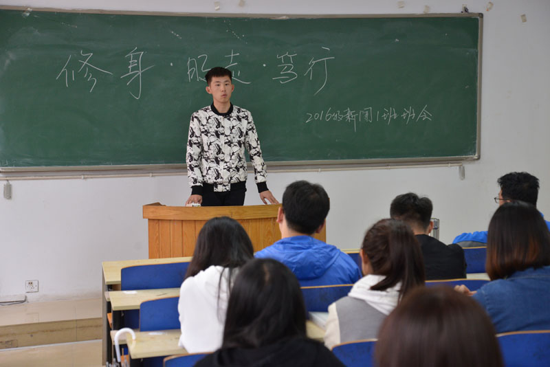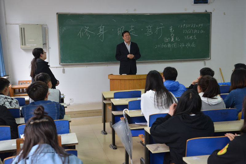 2018413 2016级新闻一班在二教102教室举行了“修身·明志·笃行”的主题班会,班级的联系领导学院党委书记张进良出席并讲话。班会由辅导员乔蕾老师主持,2016级新闻1班全体同学参加。