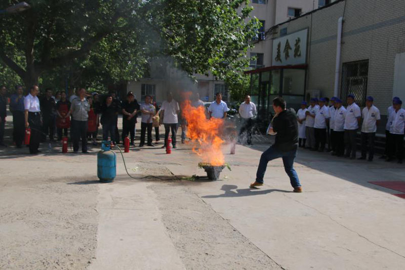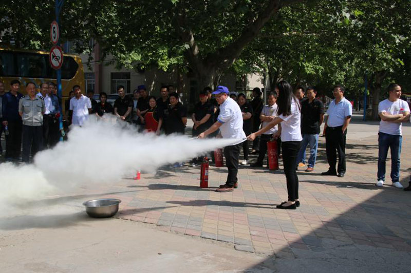 在演练现场,在专业人员的指导下,食堂工作人员亲身体验了灭火器的使用方法。