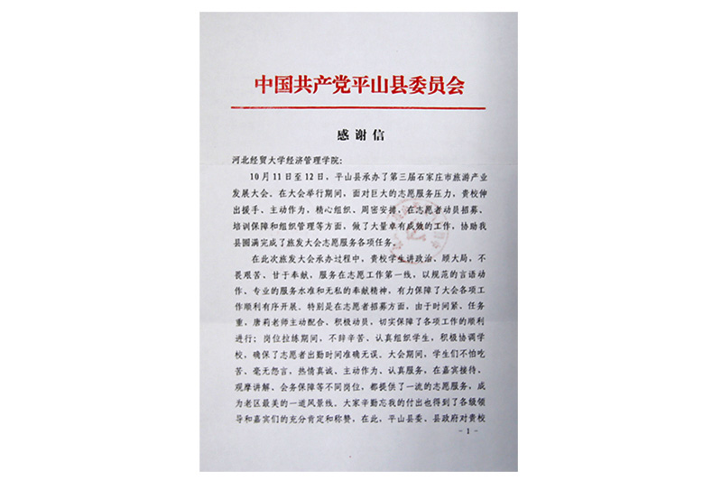 10月11日至12日石家庄市第三届旅游发展大会在平山县举行,接到平山县团委的请求,开云官网派出100余名志愿者分赴西柏坡游客中心、富力健康养生城、泓润生态园三个核心片区开展志愿服务活动,期间他们在岗前拉练、接待引导等工作中表现积极突出,得到主办方的一致好评,其中29名同学被团市委授予“优秀志愿者”荣誉称号。中共平山县委及平山县政府特别写来感谢信对学院在志愿者招募、培训保障、组织管理等方面的主动作为和精心安排表示衷心地感谢。
