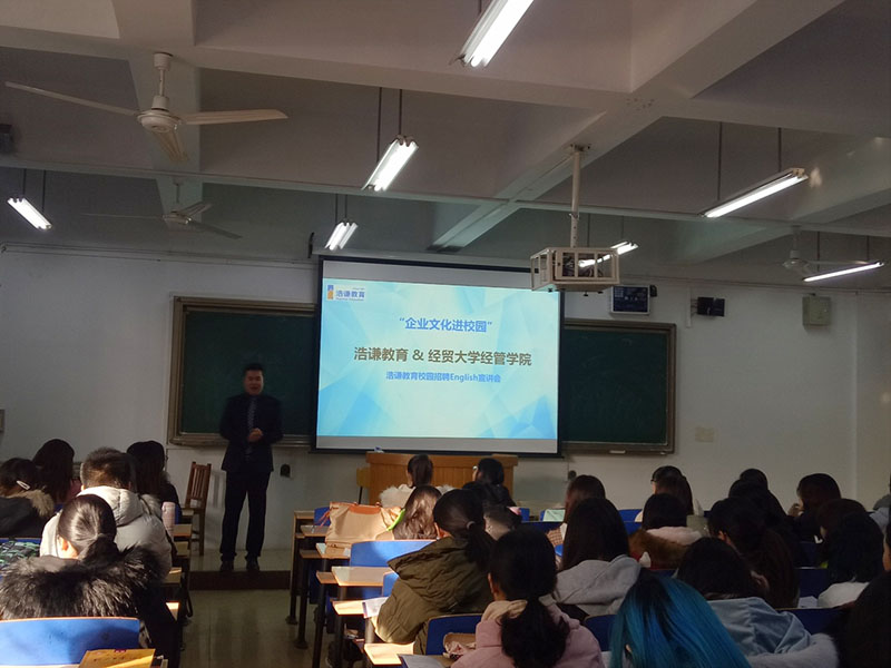 浩谦教育小学部董部长用浩谦教育老师们自制的VCR和内涵丰富的浩谦故事,向同学们介绍了企业概况、员工团队、英语特色、价值观等相关企业文化;以切身经历解读了浩谦“六个一”的文化理念,董部长还从企业招纳贤才的角度告诉同学们英语专业发展前景与择业方向、职业生涯规划、面试技巧等内容,同学们受益匪浅。