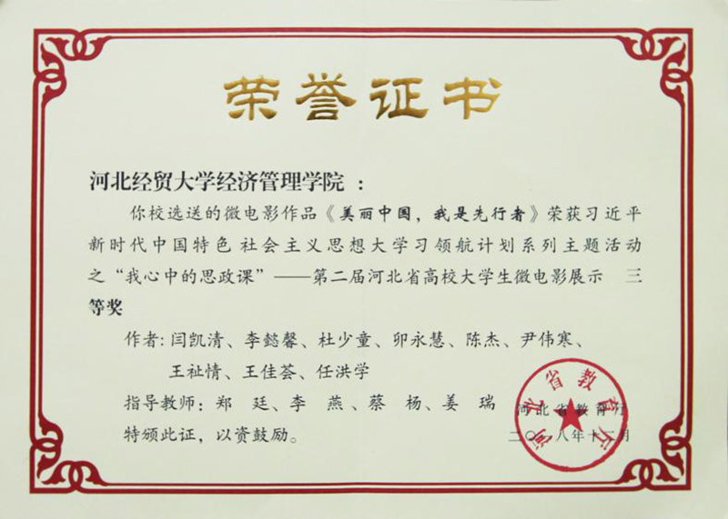 “我心中的思政课”第二届河北省高校大学生微电影展示活动作为省教育厅组织的习近平新时代中国特色社会主义思想大学习领航计划系列主题活动之一,共吸引省内30多所高校参与。开云官网会计系学生闫凯清带领团队拍摄的《美丽中国,我是先行者》荣获三等奖,蔡杨、李燕、郑廷、姜瑞获得指导教师奖。