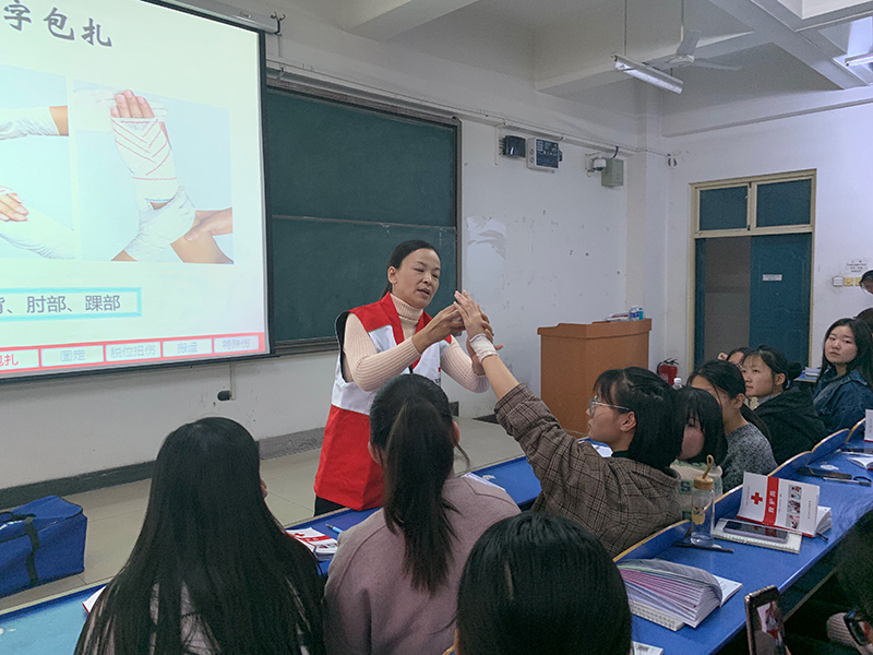 活动开始,讲解老师对红十字运动的相关历史及救护基本知识进行了详细地讲述,并通过视频展示及现场讲解等方式对心肺复苏、呼吸道异物梗阻急救、创伤救护等知识进行了重点解读。为了巩固了培训效果,下午进行了实操演练,老师分步演示,耐心讲解,学生们积极参与,反复练习。培训基本达到学生们了解熟悉应急救护知识的目的。