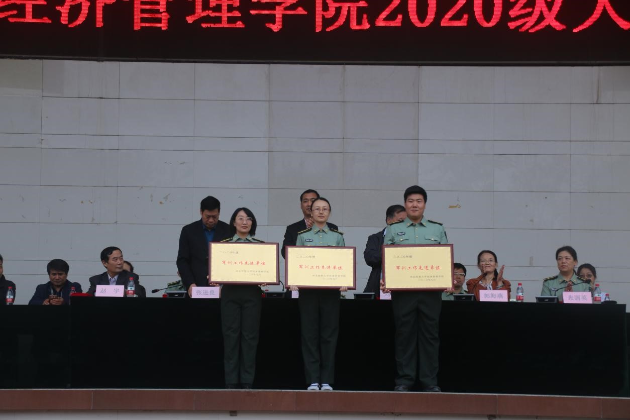 郭海燕宣读了军训工作获奖名单,管理系、商务系、文法系荣获军训工作先进单位;会计系、信息系、经济系荣获军训工作优秀组织奖。