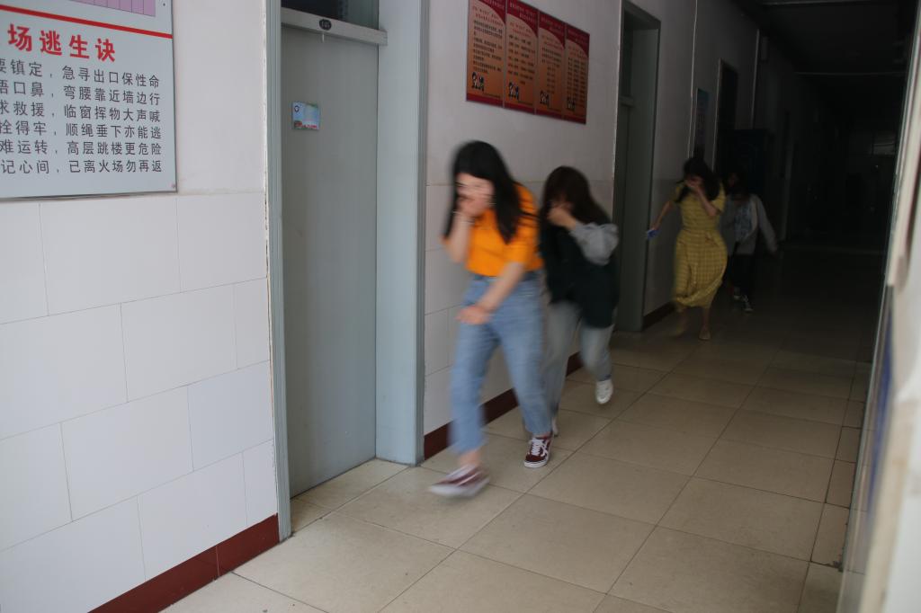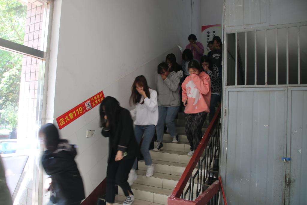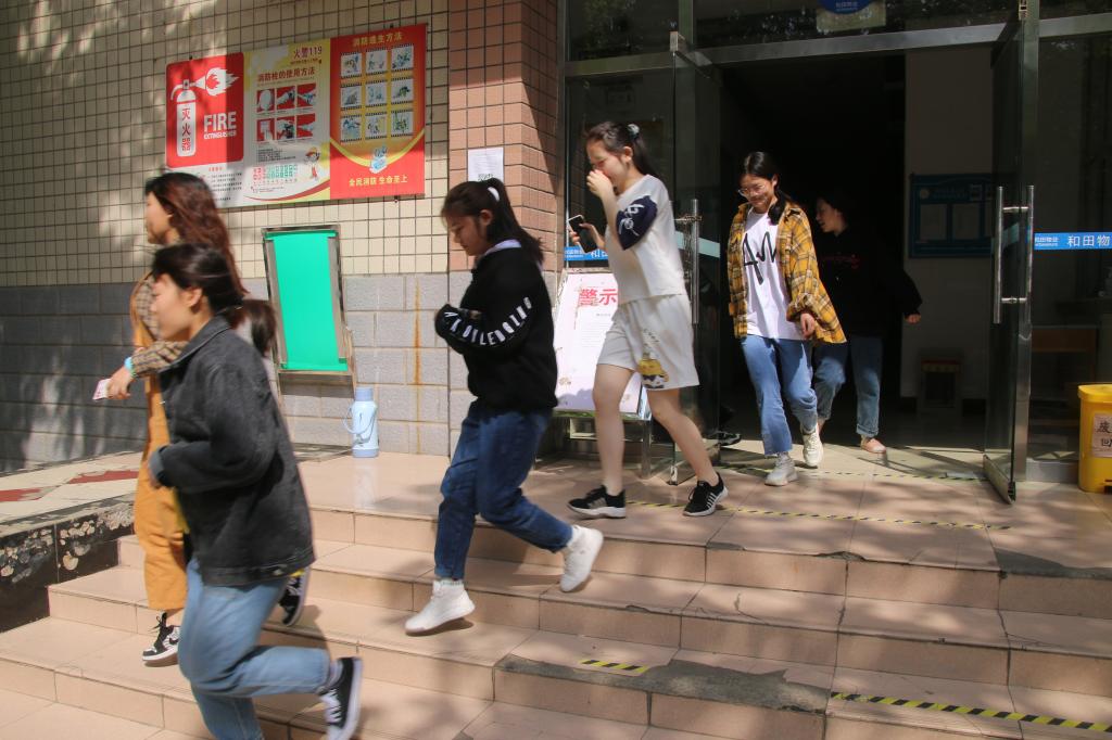 演练开始前,路士国对演练内容、疏散要求、逃生路线等事项进行了详细说明。1450分,公寓楼哨声鸣响,逃生演练正式开始,两个逃生出口被迅速打开。根据演练方案,应急疏散组成员指导学生捂住口鼻,伏低身体,快速撤出宿舍,按照预设的逃生路线,有序地撤离到图书馆广场,并清点人数上报到指挥小组。校医院医护人员随时待命。整个疏散演练井然有序,快速完成。