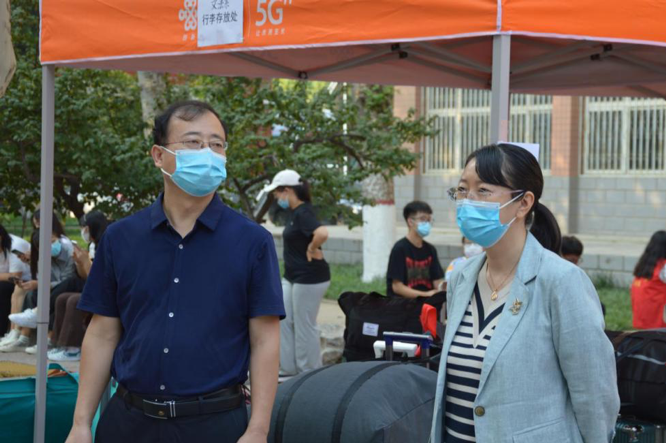 王鸿喜和张丽媛在迎新现场随时处理学生问题