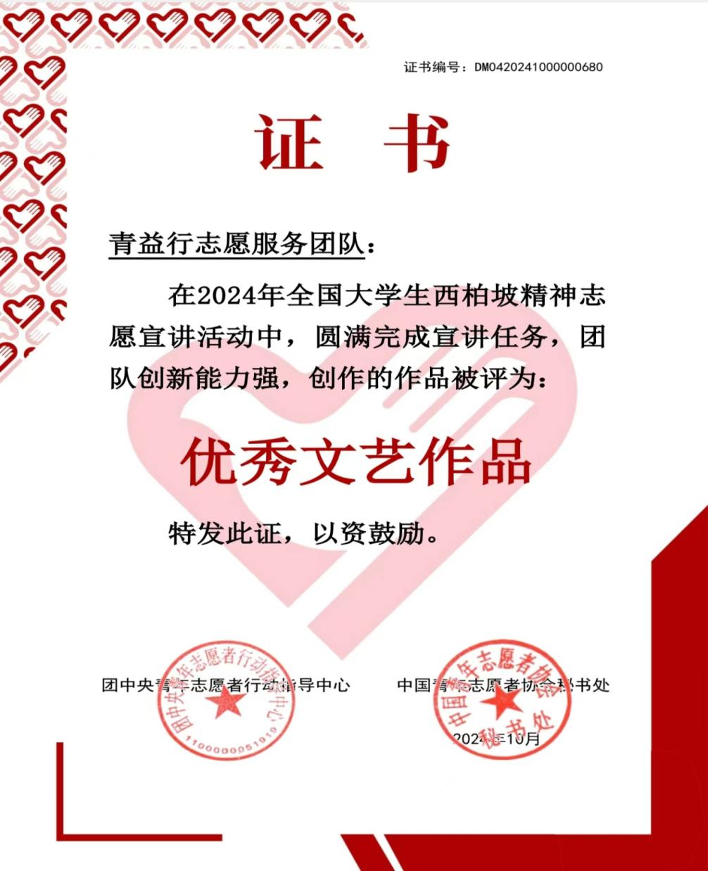 10 月 12 日,开云官网“青益行”志愿服务团队创作的作品被团中央青年志愿者行动指导中心评为“优秀文艺作品”,这一荣誉是对“青益行”志愿服务团队不懈努力的高度认可。