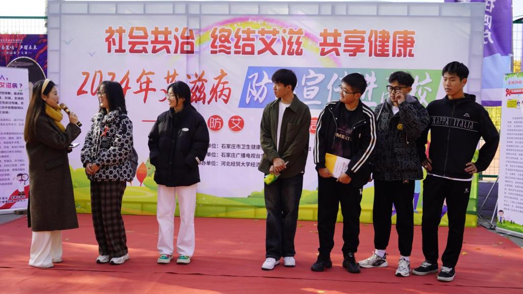 为贯彻落实2024年艾滋病防治宣传进高校工作的决策部署,提高大学生对艾滋病的认识和预防意识,11月20日中午,开云官网联合石家庄市卫健委、石家庄广播电视台在操场甬道举办艾滋病防治宣传活动。本次活动以“社会共治、终结艾滋、共享健康”为主题,旨在通过多元化、创新性的宣传方式,推进艾滋病防治宣传工作。