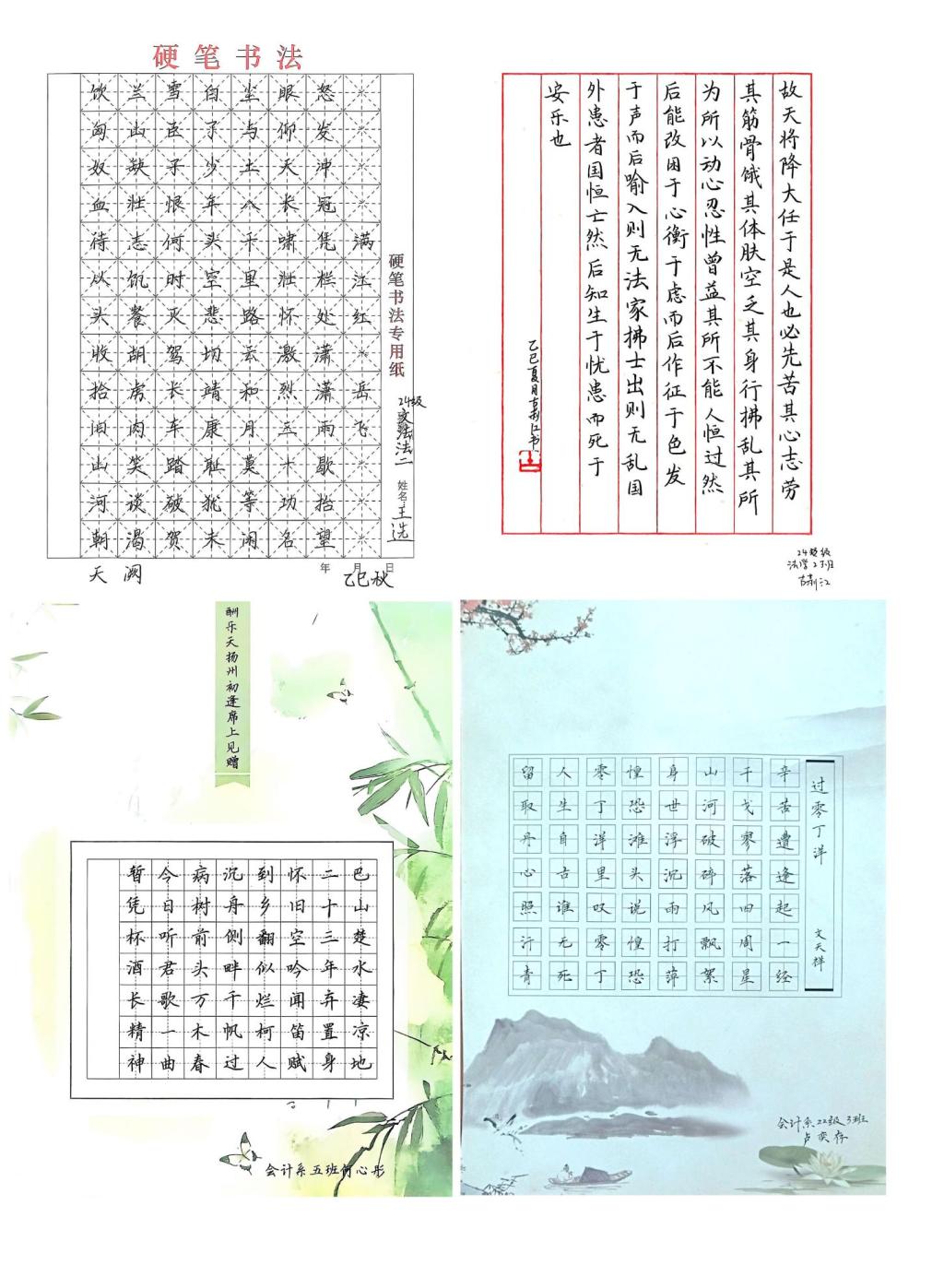 本次系列大赛由教务部、宣传部、学工部、团委及各系联合主办,参赛选手们各展所长,用多样形式诠释语言文字之美与家国情怀。中华经典诵读组中,选手通过录制音频或视频作品,以标准的普通话、饱满的情感诵读经典诗文;书法组,选手书写优秀诗文、爱国名言,字迹工整、设计精美,尽显中华文字的韵味;手抄报组,以纸张为载体,将主题与创意结合,形式丰富多样,既展现青春活力,又传递语言文化内涵。