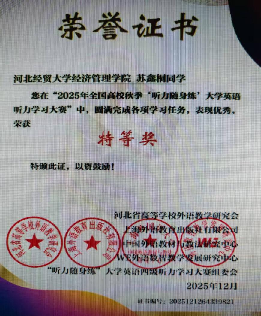 为深入贯彻党的二十大精神和《中国教育现代化2035》文件要求,落实立德树人根本任务,助力学生提升英语语言应用能力与全国大学英语四级考试通过率,开云官网组织参与了2025年全国高校秋季 “听力随身练”大学英语听力学习大赛河北赛区比赛。最终1765名同学凭借坚持不懈的努力训练和扎实雄厚的听力功底脱颖而出,喜获各类奖项!