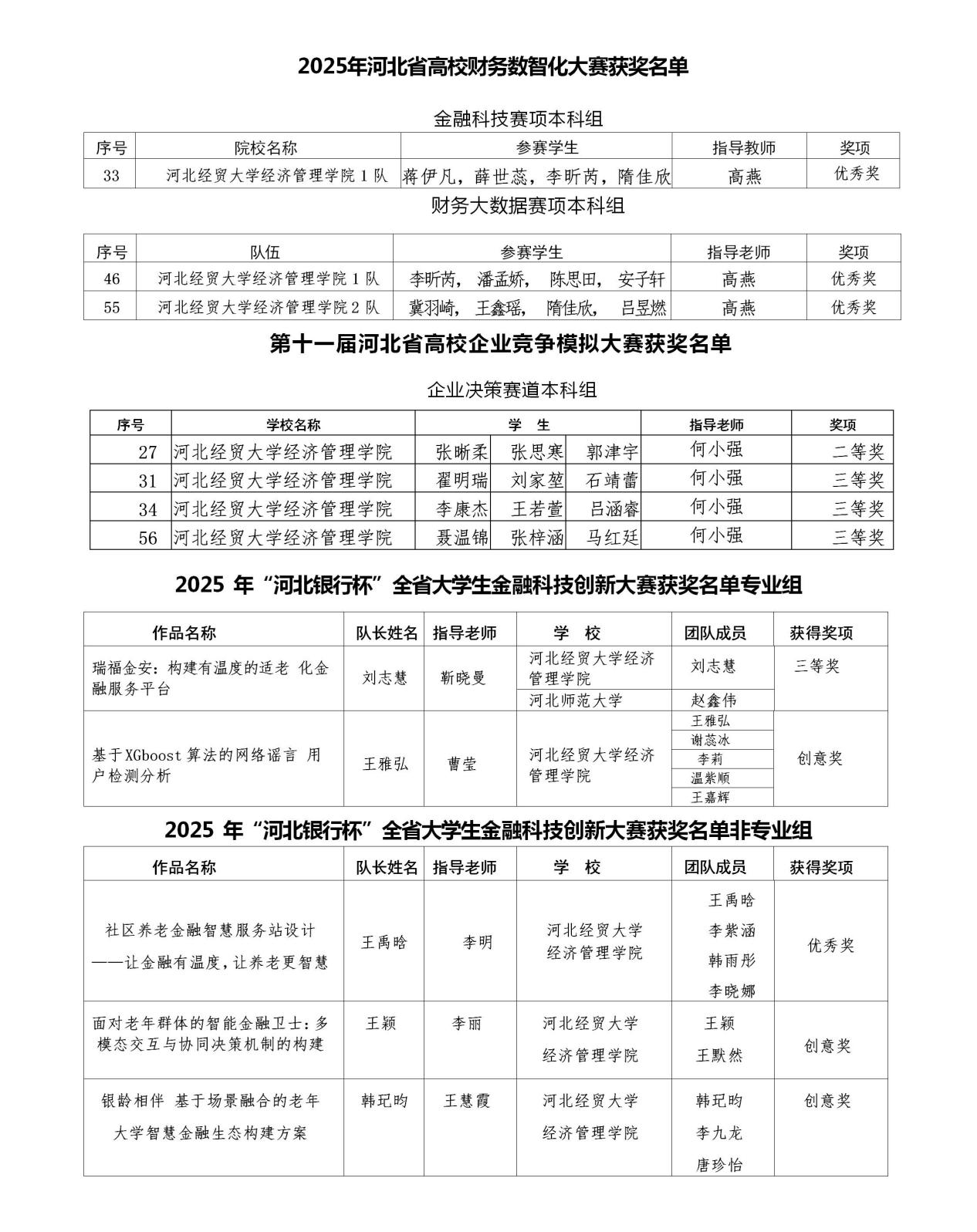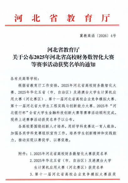 在2025年河北省高校财务数智化大赛中,由高燕教师指导,蒋伊凡等同学组成的“开云kaiyun登录入口1队”,在金融科技赛项本科组中获得“优秀奖”。在财务大数据赛项本科组,李昕芮、冀羽崎两支队伍获得优秀奖。