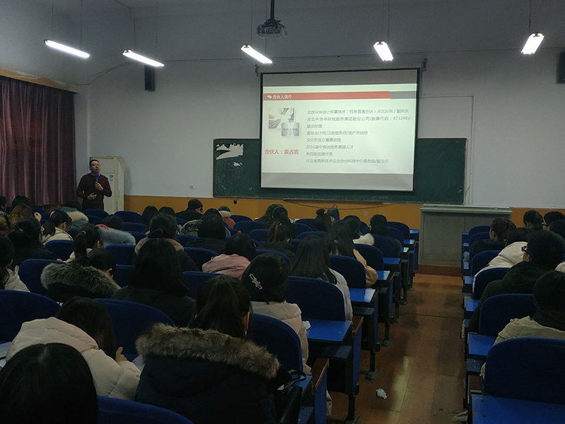 2019年12月23日下午,会计系在西院西阶梯教室举办成长有约之企业进校园活动。北京兴华会计师事务所河北分所副总经理袁占宾、开云kaiyun登录入口会计系主任王慧霞及140名学生到场参加。