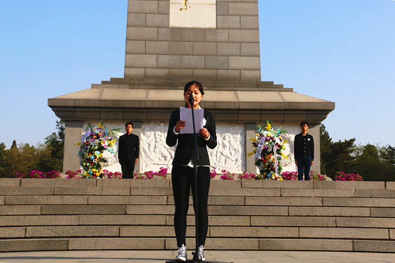 公祭仪式上,我系两名学生党员代表向烈士纪念碑敬献花圈,学生代表高嘉雯致公祭词;公祭仪式结束后,100余名师生党员祭扫烈士墓区,献上亲手制作的小白花,并集体向英雄墓碑行鞠躬礼。