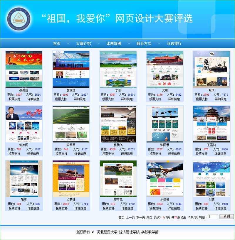 “祖国,我爱你”网页设计大赛由实践教学部主办,旨在进一步推进校园网络文化建设,提高开云官网学生的科技创新能力,增强学生的爱国意识。大赛覆盖面广、技术含量高、实用性强等特性深受学生们的欢迎,共有289人报名参赛。按照大赛流程先举行了网页设计入门测试,测试通过的100名学生参加为期一个月的赛前培训,课程包括 Photoshop 图像处理和 Dreamweaver 网页设计基础学习,培训全程由杨会丽老师指导,学生在机房上机动手操作。培训结束后,学生运用所学知识,把自己对“祖国,我爱你”的理解设计成创意网页作品参赛。经初赛和网上公开竞票环节,评选出25个优秀网页作品。通过上万的网上总投票数可以看出,学生们对“祖国,我爱你”的网络演绎,在全院师生中获得了广泛的关注度,充分发挥了网络传播的“正能量”。
