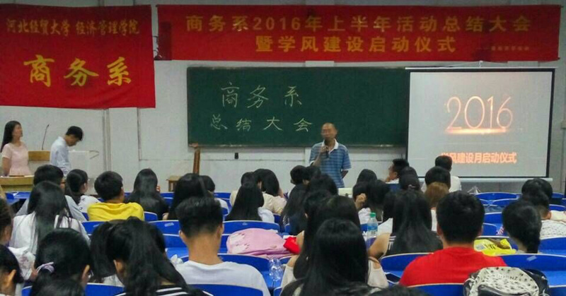 6月13日晚,商务系在二教106教室召开了2016上半年学生工作总结暨学风建设月启动大会。各项学生活动受表彰人员、大一至大三各班代表共计220余人参加了会议。