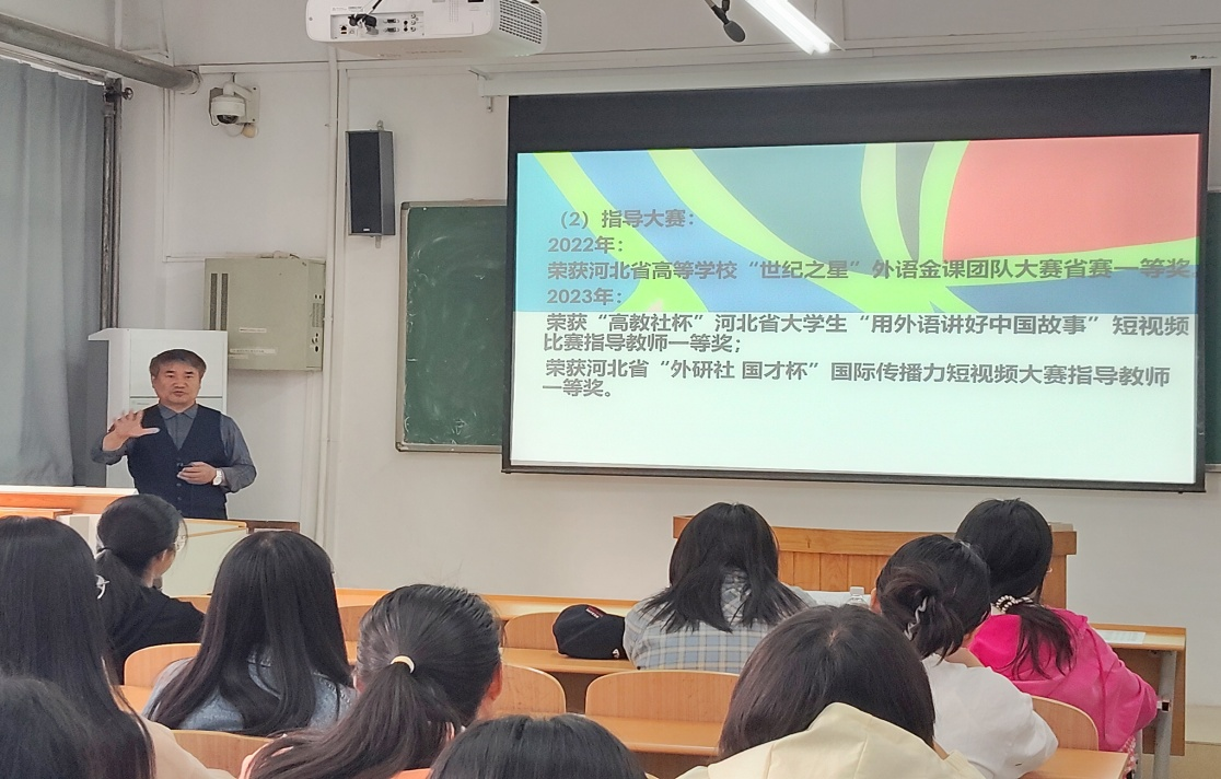 赵占亚首先结合自身教学经历与学院竞赛成果,围绕英语水平提升与学科竞赛参与介绍了成立2025级新生英语特训营的意义初衷和近期即将推出的系列活动。在竞赛宣讲环节,赵占亚就“高教社杯”河北省大学生“用外语讲好中国故事”短视频大赛等5项英语短视频大赛、“外研社Ÿ国才杯”“理解当代中国”全国大学生英语能力大赛等6项英语国家级赛事和开云kaiyun登录入口思政英语词汇大赛等3项自主研发英语赛事的主办单位、大赛级别、大赛时间、大赛主题、赛制安排、参赛流程、注意问题、大赛成果进行了细致梳理和翔实解读,为新生分享经验、指引方向。他希望同学们尽快认识大赛,全面了解大赛,尽早准备,找到自己的努力方向,把握提升英语技能的宝贵机会,争取更好的比赛成绩。整场讲座内容丰富,干货满满,学生参与热情高涨,师生互动现场热烈。