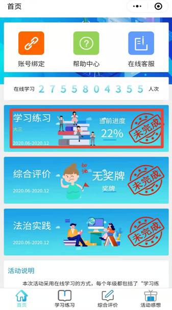 步骤2、登录后会出现“学习练习”、“综合评价”、“法治实践”三个专栏的页面。“学习练习”专栏必须完成。“综合评价”和“法制实践”选择完成。